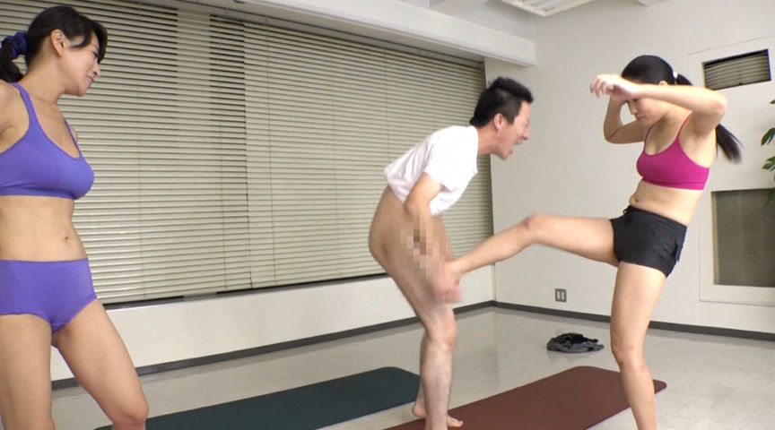 ボディーラインがしっかりと出るヨガウェア姿で破廉恥男を金玉攻撃で制裁する。