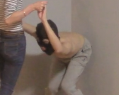 ジーンズにハイヒールの女性が金蹴り、踏みつけをします。
