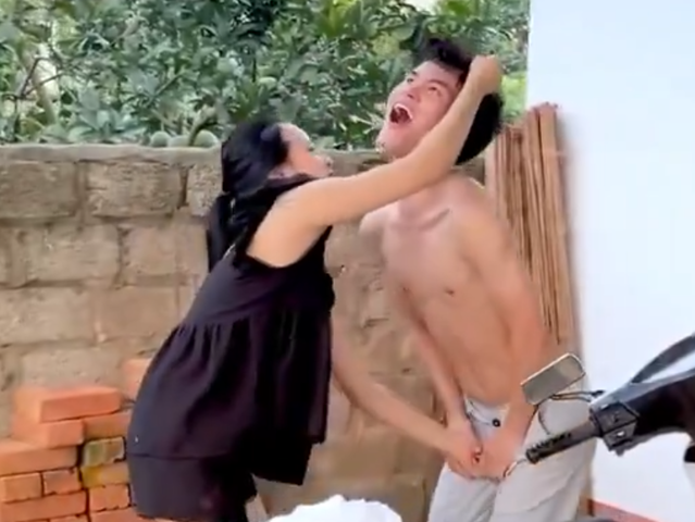 後半のふたりは恋人どうしで、ケンカになるといつもこうやってカノジョが勝つそうです。