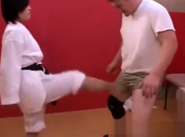 女空手家が金蹴りをします。